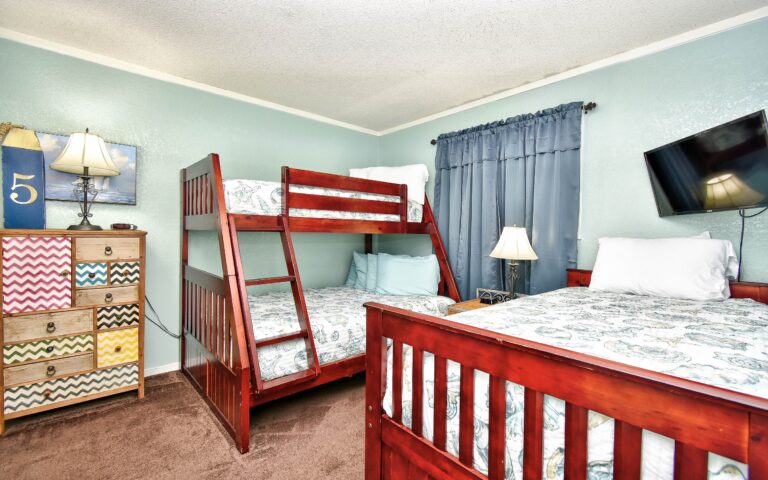 As soon as you enter the condo you will find our two bedrooms. The first bedroom is equipped with a HDTV and a Queen bed, with a memory foam mattress. The second bedroom has two bunk beds: a twin over full and a twin over twin bunk bed. This bedroom also has exclusive access to the second bathroom. Both of our bathrooms are equiped with handheld shower heads and bath tubs. Our living room is just down the hallway from the bedrooms and it features a flat screen TV, a queen sized sofa sleeper and two comfy chairs along with books, toys and game boards!